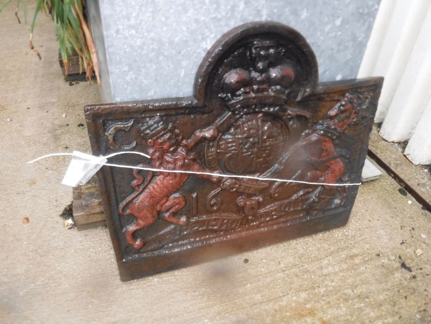 A cast iron fire back with lion and unicorn motifs and dated 1664, initialled "CR" to corners, 74 cm long x 65 cm high