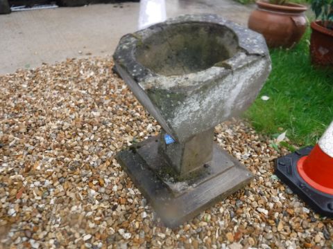 A composite stone bird bath / garden urn raised on square tapering base, approx 36 cm x 36 cm x 53 cm high
