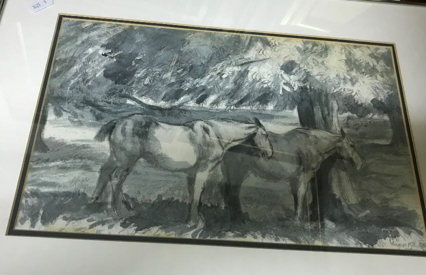 ENGLISH SCHOOL "Horses by trees", pencil wash, dated lower right "August 15th 1957", size including frame approx 36.5 cm x 49 cm, together with WILLIAM HUNTER "River barges", watercolour, signed lower right, JOHN HALL "River Avon", oil on board, signed and dated verso N WELLMAN "Coastal town scene", watercolour heightened with white, signed lower left, ELEANOR HUGHES "Alpine town", watercolour, signed lower left and ENGLISH SCHOOL "Cottage and figure", oil on canvas, unsigned