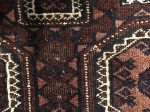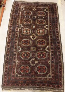 A Belouch tribal rug, the central panel set with repeating elephant foot style medallions on a dark aubergine ground, within a stepped dark aubergine and black geometric patterned border, bears signature, approx 193 cm x 112 cm