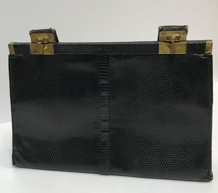 A vintage Jane Shilton black dyed snakeskin handbag with brass clips, 31 cm wide x 20 cm high (not including handle)