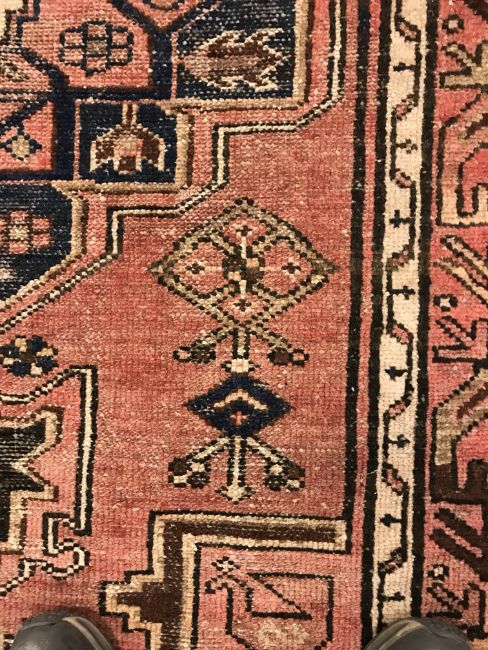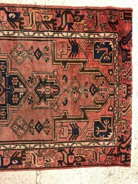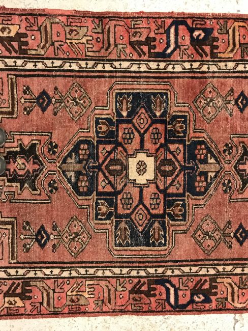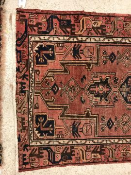 A Caucasian rug, the central panel set with stylised medallion on a pink geometric and stylised bird motif decorated ground, within a stepped pink and cream border, approx 103 cm x 195 cm