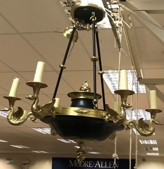 A brass and black painted metal six branch electrolier in the Empire style with swan decoration to each sconce, approx 69 cm diameter, together with another modern electric six light electrolier