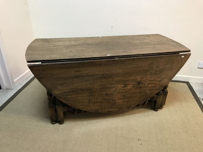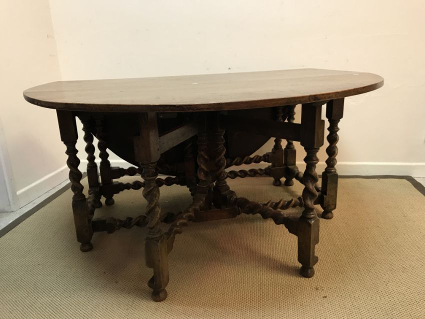 An oak oval double gate-leg drop-leaf dining table on barley-twist supports in the 17th Century style, 152 cm wide x 178 cm long x 72 cm high
