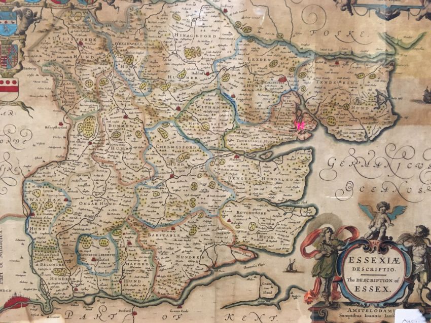 AFTER IOANNIS IAMBONII "Essexiae descriptio - the description of Essex" a hand coloured engraved map with script pages 203 and 204 verso in French 38 cm x 49 cm