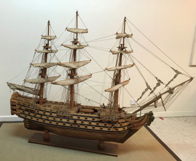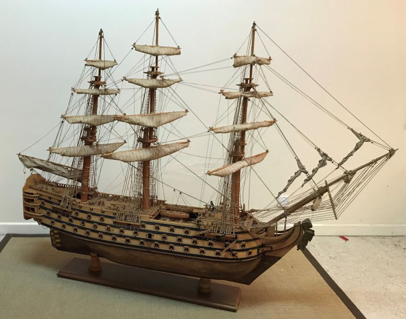 A mid 20th Century craftsman built wooden model of HMS Victory together with copy of Harrods valuation dated 3rd July 1976 .... "Sir: this is to certify that that model of the ship "Victory" purchased from the gift department could not be replaced at this moment in time for less than £3000 yours faithfully H. Bassadone, Buyer" 218 cm long x 165 cm high including twin pedestal stand