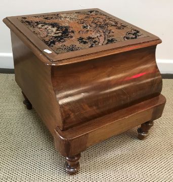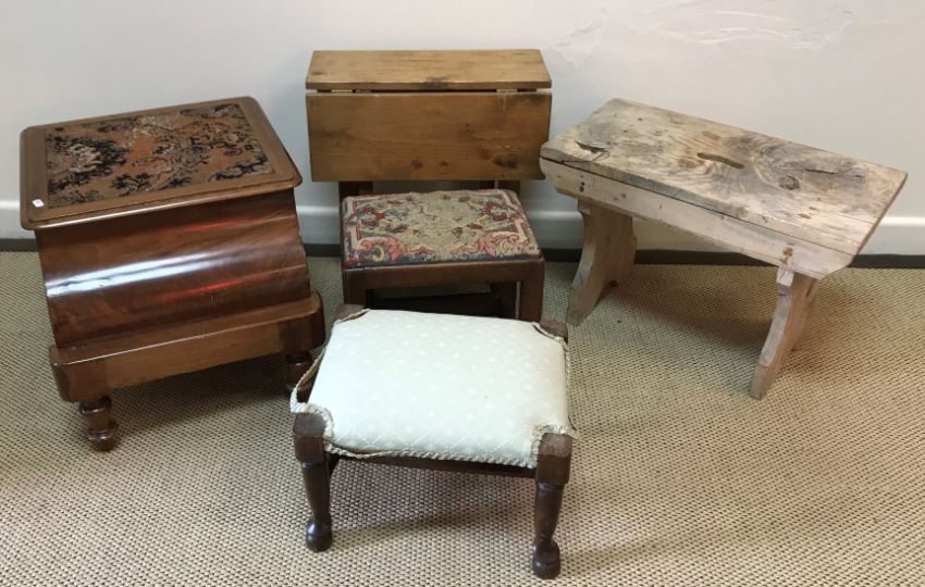 A mahogany rectangular extending dining table with reeded edge on square fluted and tapered legs to spade feet and castors, 137 cm long x 106.5 cm wide x 73 cm high, together with three small stools, pine drop-leaf gate-leg occasional table, an onion pattern table lamp and a Victorian mahogany commode stool with carpet top