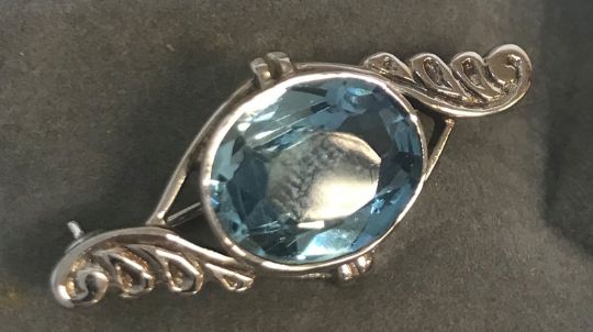 A 9 carat white gold and aquamarine set brooch, 3.5 cm long, total weight including stone 6 g