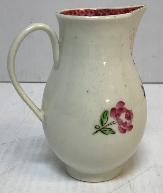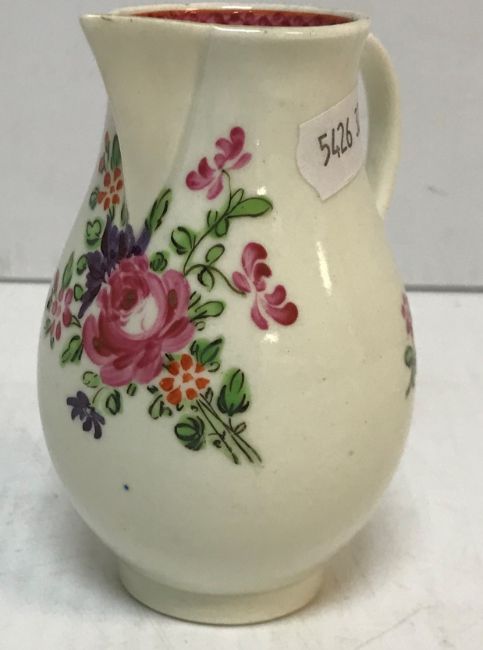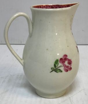 An 18th Century Liverpool type baluster shaped sparrow beak cream jug with floral spray decoration, 10 cm high