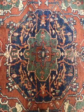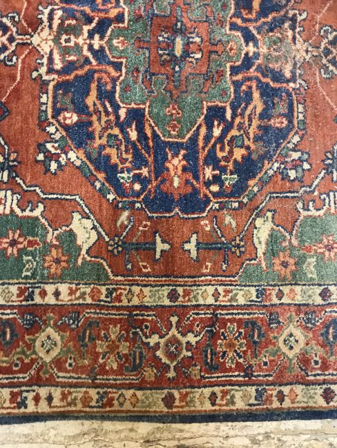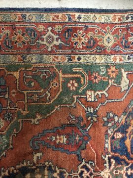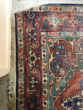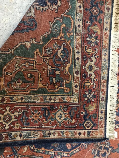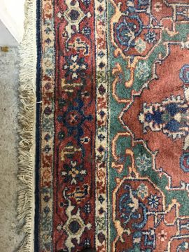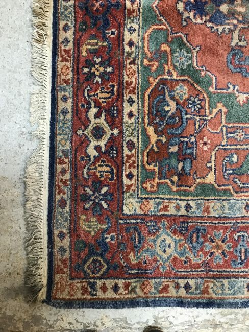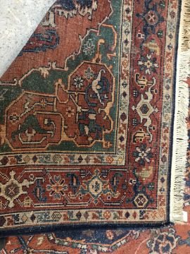 A 20th Century Indian carpet, the central panel with floral decorated medallion on a red and green ground, within a stepped red, cream and blue stylised floral decorated border, approx 263 cm x 183 cm