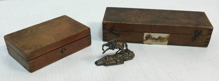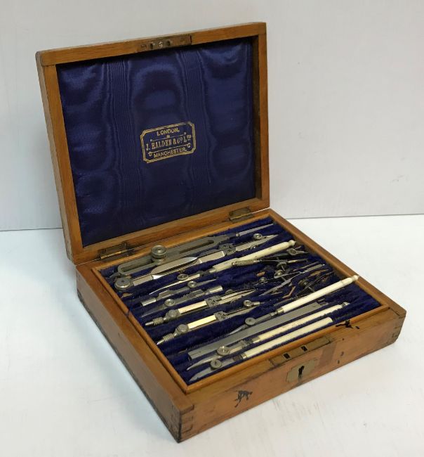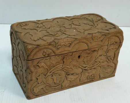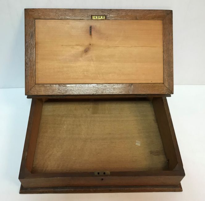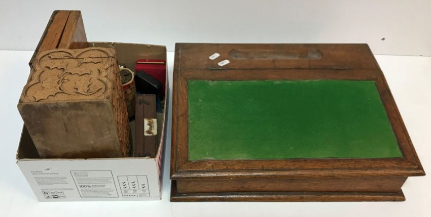 An oak desk top clerk's writing slope 35 cm deep x 43 cm wide x 10.5 cm high, a carved wooden tea caddy decorated with holly leaves, an early 20th Century oak cased compass set, and a cased brass paper cutter stamped "C.A. Smiths Patent"