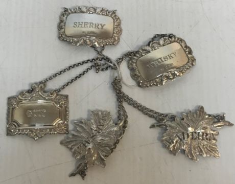 Two Victorian silver wine labels in the form of vine leaves, one pierced "Madeira", the other "Marsala" together with two modern wine labels inscribed "Sherry" and "Whisky" (Bishton's Ltd) and a plated "Gin" label weighable silver 1.7 oz