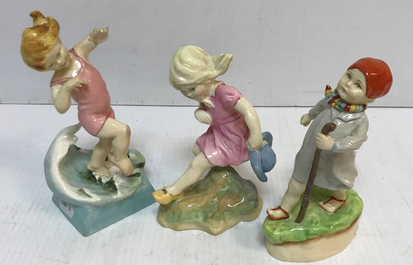 Three Royal Worcester figurines including "July" (3440) modelled by F.G. Doughty 17 cm high, "March" (3454) 14.5 cm high and "Thursday's child has far to go" (3260) 15 cm high
