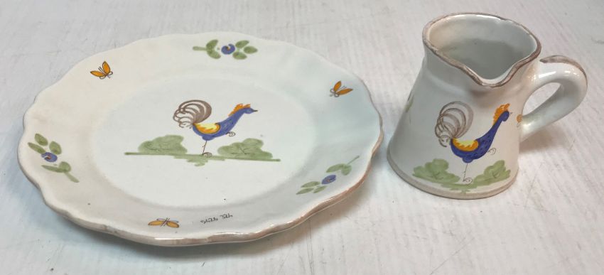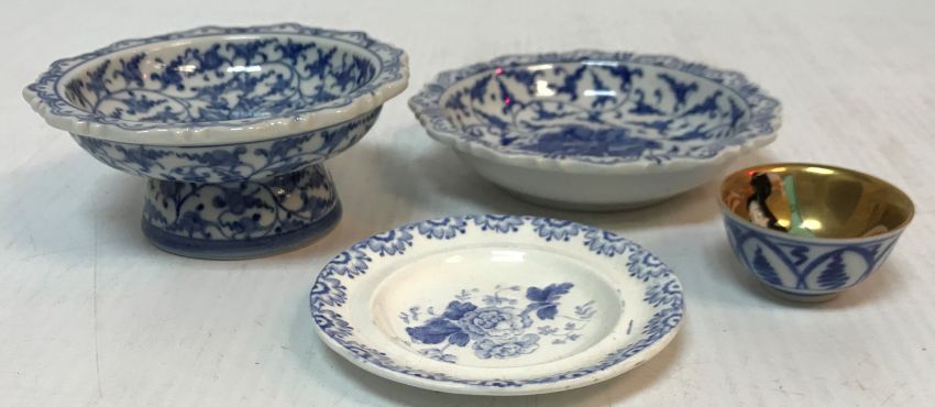 A Quimper pottery plate and jug, Thai stem cup and bowl, Japanese figural decorated bowl, Davenport blue and white dolls' house saucer, a studio pottery part coffee set, a blue and white coffee can with figural decoration and a pair of coloured pottery seated dove figures