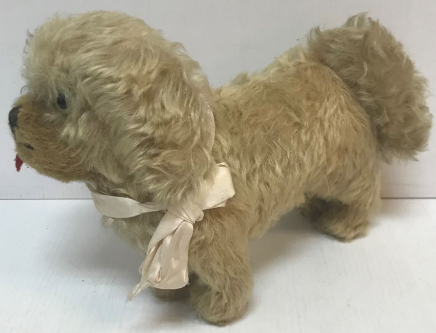 A wood wool filled pale gold plush mohair dog with tongue protruding and glass eyes and squeaker approx. 33 cm long x 25 cm high