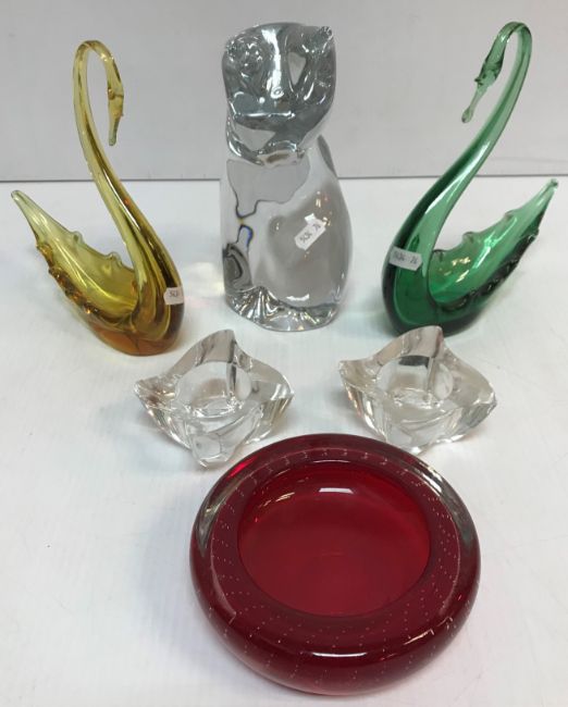 A Daum clear glass figure of a seated cat with etched signature 23 cm high together with two Murano style glass swan dishes/vases, one in amber, one in green 22 cm high together with a Whitefriars type bubble ashtray and a pair of Villeroy and Boch candleholders