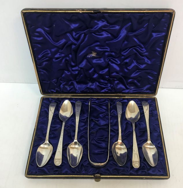 A cased set of six Georgian silver cut bright tea spoons (London, 1801 by Peter, Anne and William Bateman) together with an associated pair of cut bright sugar tongs 3.2 oz