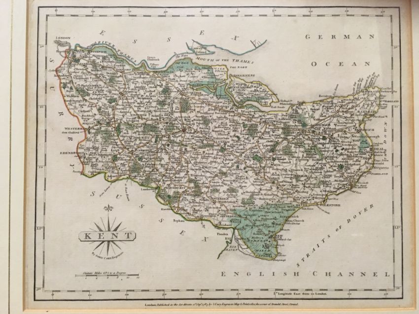 AFTER JOHN CARY "Kent" a coloured engraved map published 1st September 1787 21 cm x 26 cm together with two further maps "Shropshire" and "Wiltshire"