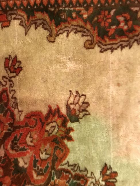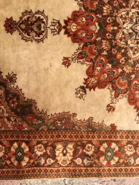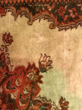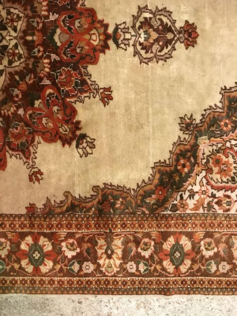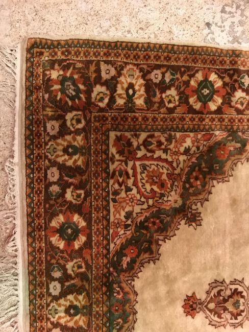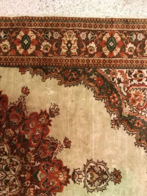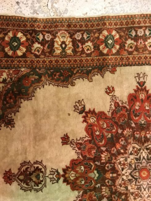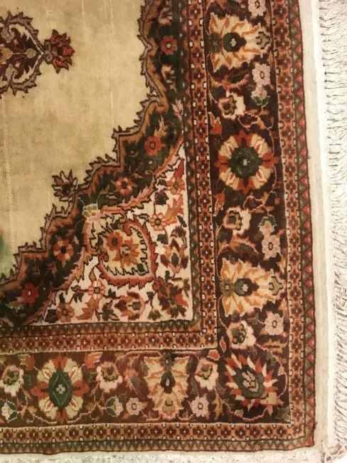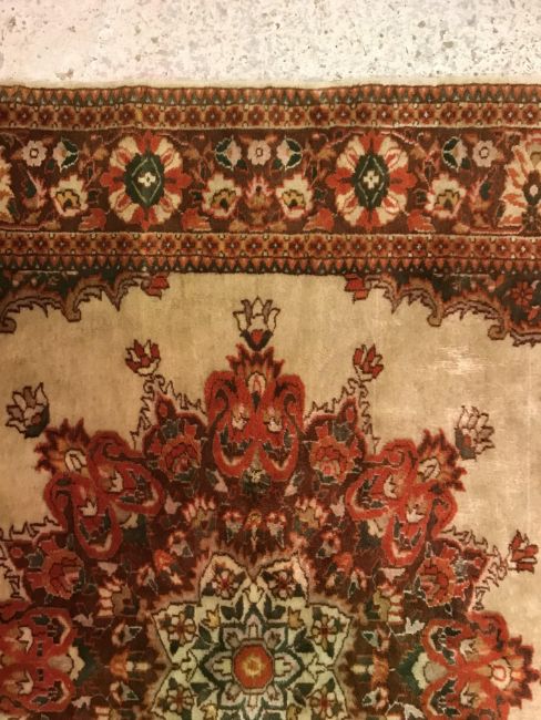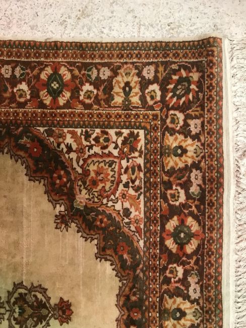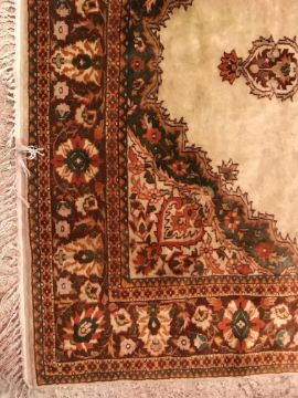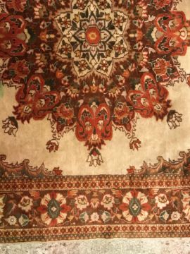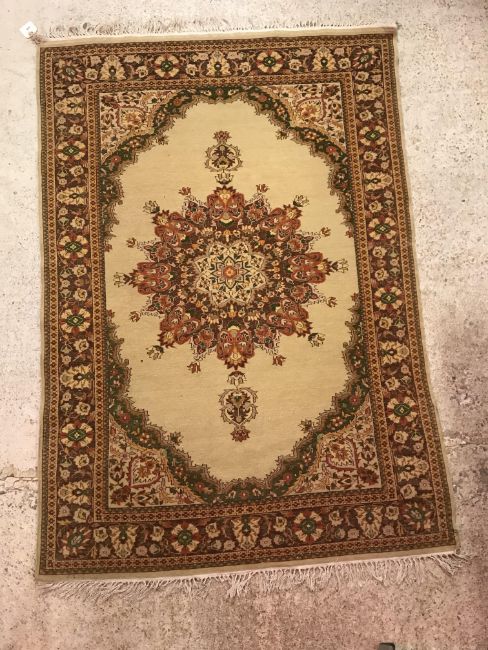 A Persian rug, the central panel set with foliate decorated stylised flower head medallion on a cream ground, within a stepped cream, orange and green floral decorated border, approx 187 cm x 127 cm