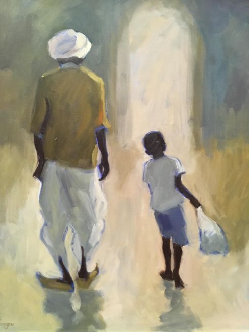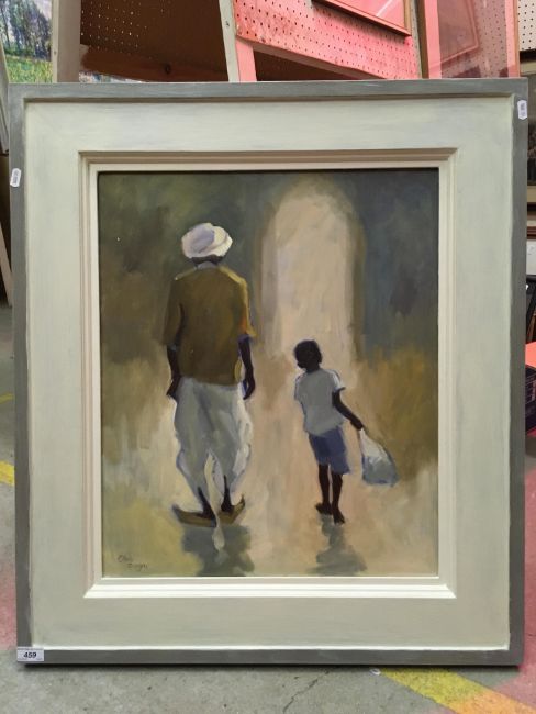 CLARE GRANGER "Buying provisions (India)" study of man and boy with bag, oil on canvas, signed lower left, inscribed on Brian Sinfield Gallery label verso 60 cm x 50 cm