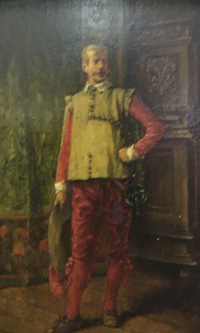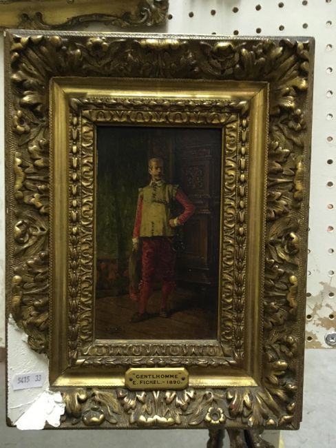 EUGENE FICHEL "Gentelhomme", study of a gentleman in 17th Century dress in an interior, portrait study, full length, oil on panel, signed lower left, titled with artist's name and dated 1890 to gilt plaque, 17 cm x 10 cm