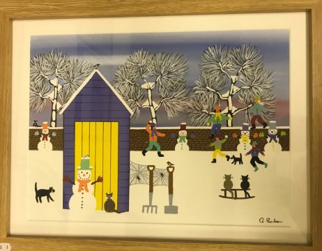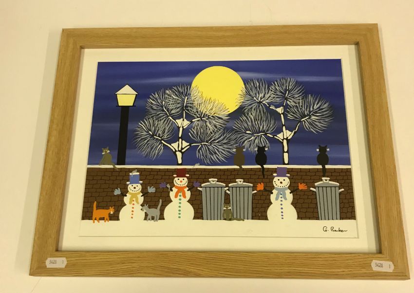 GORDON BARKER "Dazzling moon", "Snowball fight" and "Watching the train in the tunnel" gouache, all signed lower right, all 25 cm x 34 cm (3)