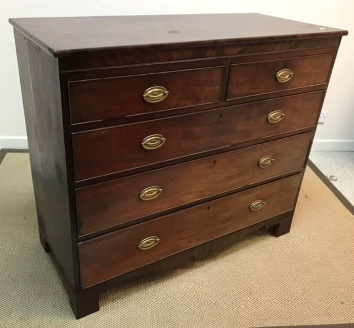 A Regency mahogany square fronted chest, the plain top above two short and three long graduated drawers and fretwork carved apron, raised on bracket feet, 124 cm wide x 55.5 cm deep x 107.5 cm high