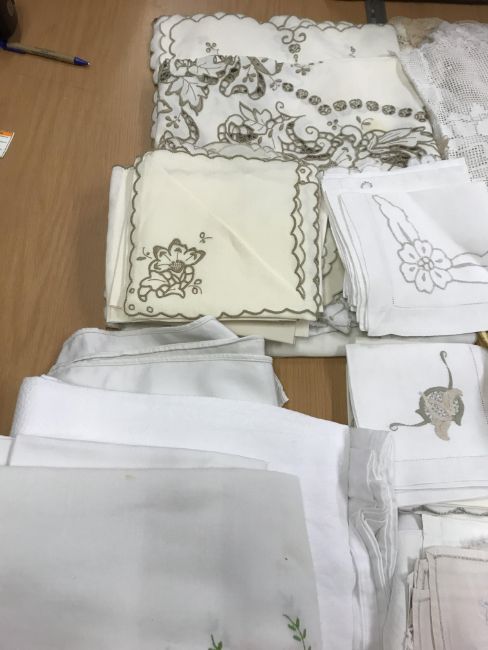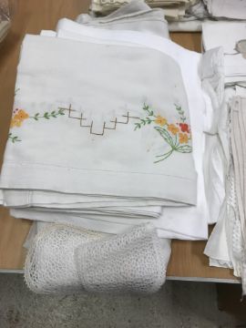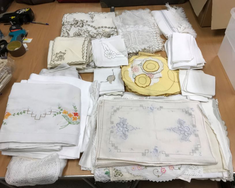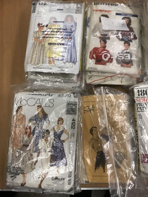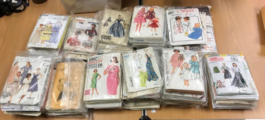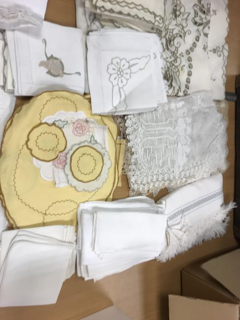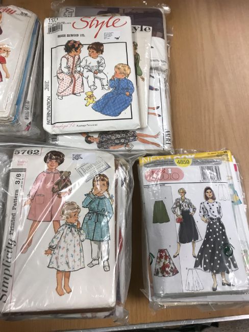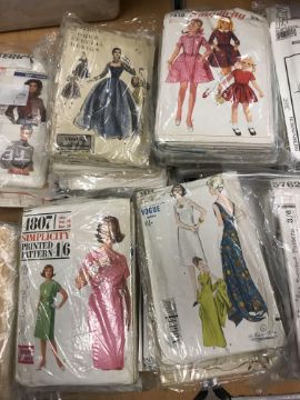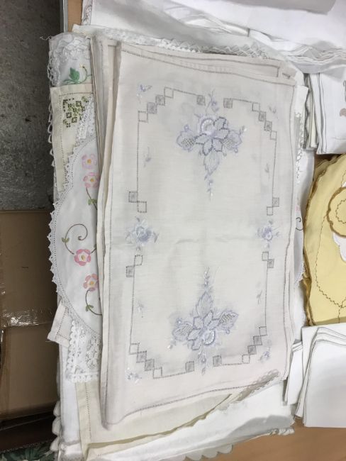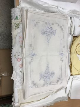 A box of assorted vintage and modern sewing patterns to include Simplicity, Butterick, Vogue, McCalls, to include wedding dresses and underwear and a collection of various table linen, doilies, etc