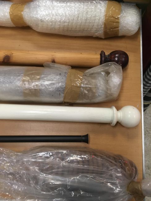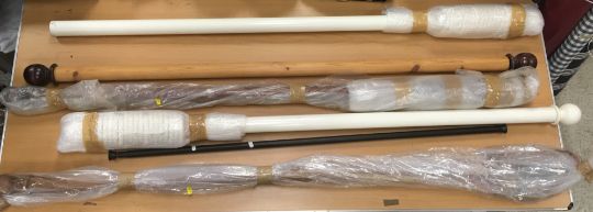 A collection of five various wooden curtain poles, some painted, some stained, with knob finials, longest 182 cm, together with an expandable shower curtain rail