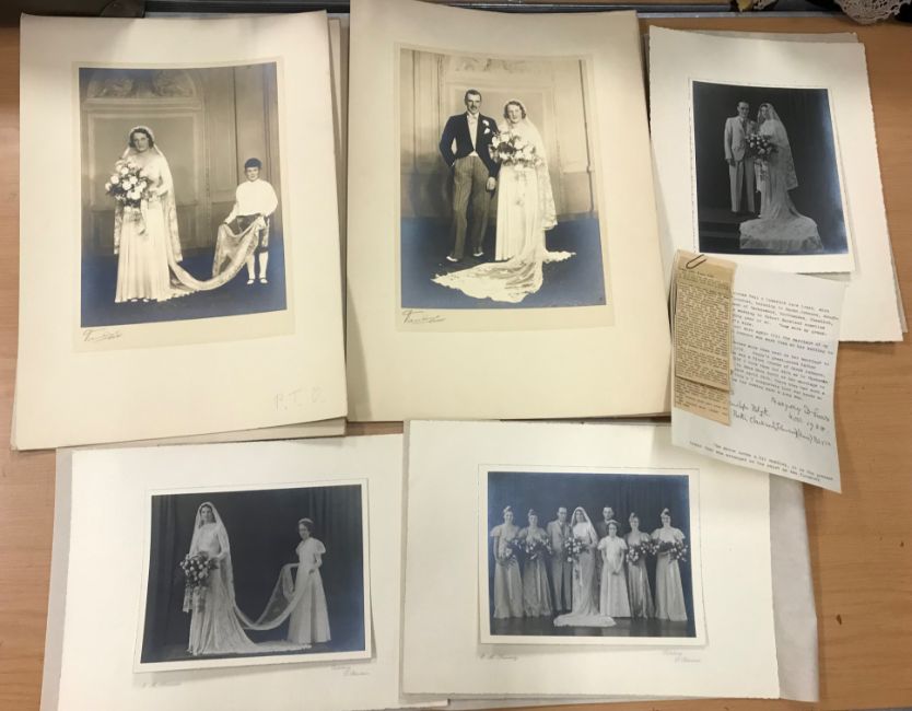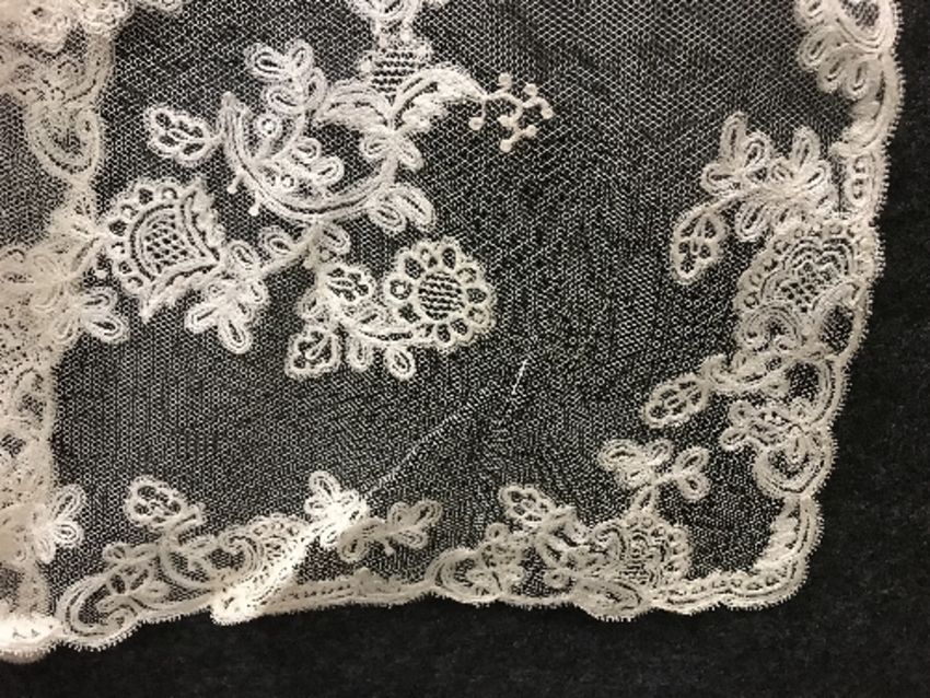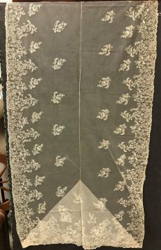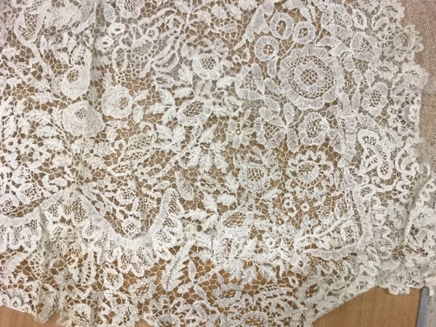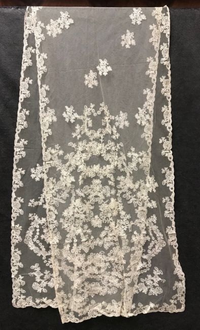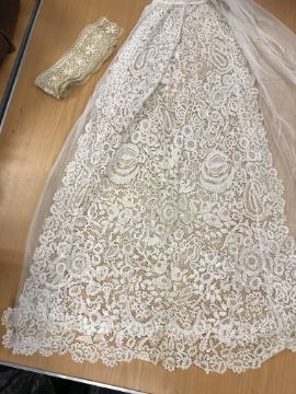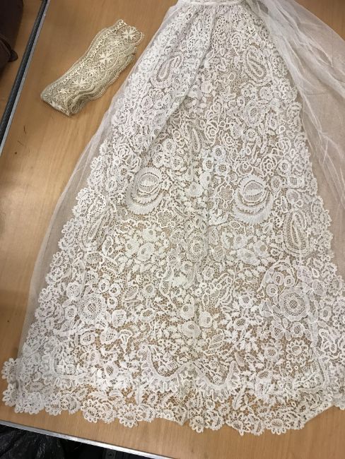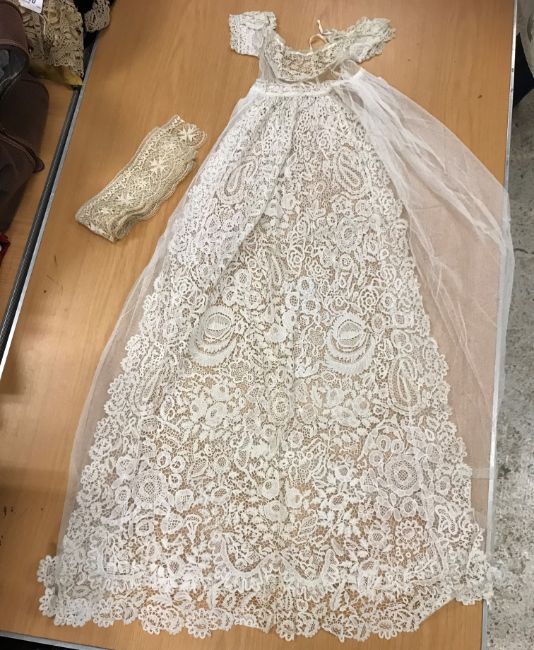 A box containing a London lace or Carrick Macross veil and Limerick lace train, worn for a wedding circa 1840, several times thereafter by family members, latterly by Penelope Blythe May 7th 1963, together with various photographs of ladies wearing the lace and veil at weddings, together with a lace Christening dress and a section of lace trim
