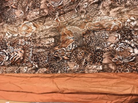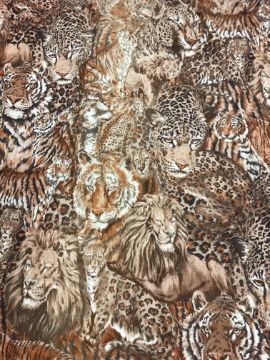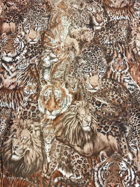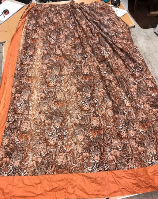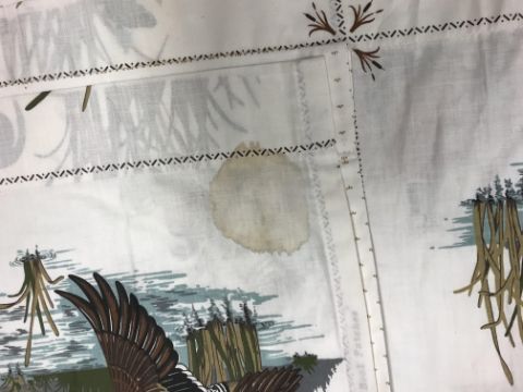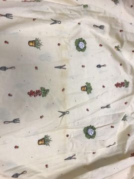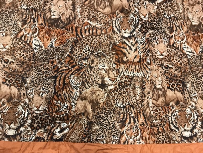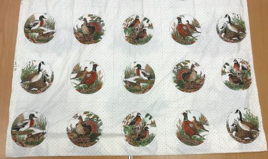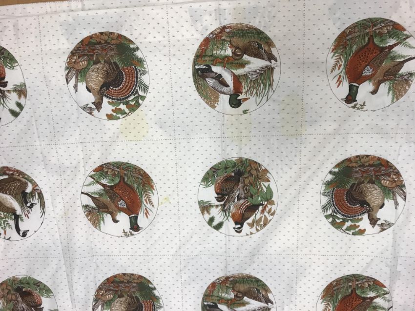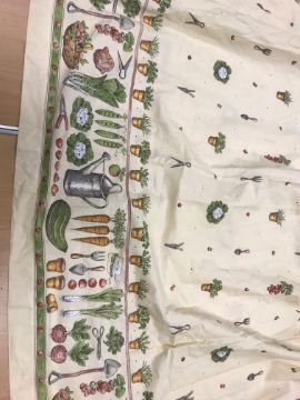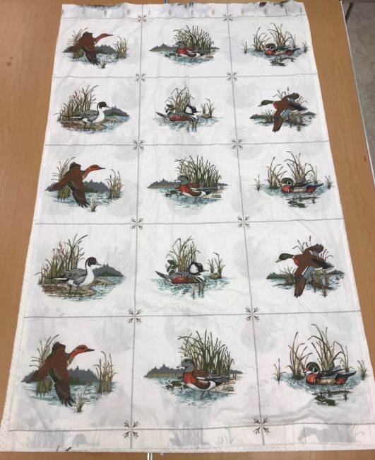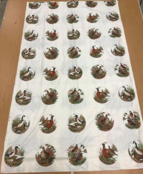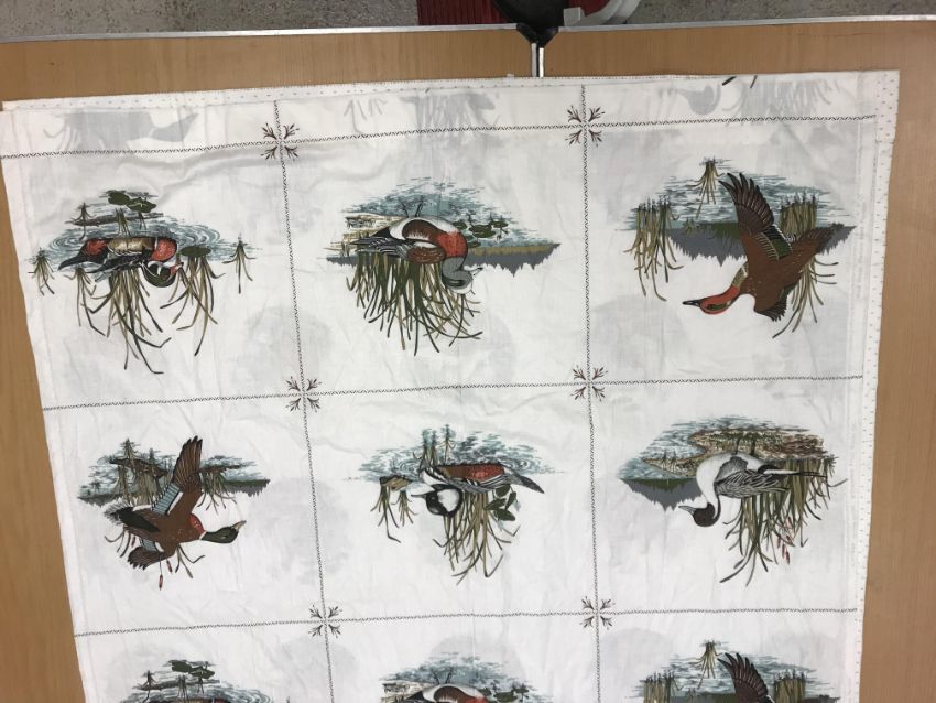 A pair of Robert Kaufman "big cat" design cotton curtains with lining and taped pencil pleat headings, approx 250 cm drop x 235 cm wide at bottom, a pair of cotton cream ground "vegetable and garden implement" decorated curtains with taped pencil pleat headings, approx 123 cm drop x 161 cm wide at bottom and a pair of Cranston Print "Wild ducks" and "Game birds" picture book patches curtains with taped headings, approx 170 cm drop x 105 cm wide at bottom CONDITION REPORTS Robert Kaufman "big cat" curtains - Poor - sun fading throughoutVegetable and garden implement curtains - Poor - some staining through the middle "Wild ducks" and "Game birds" curtains - Fair - some staining to the edges