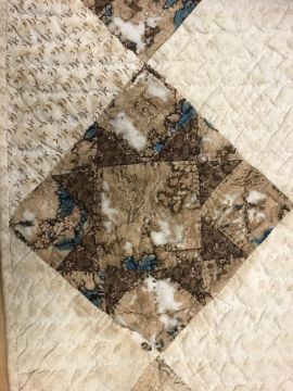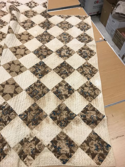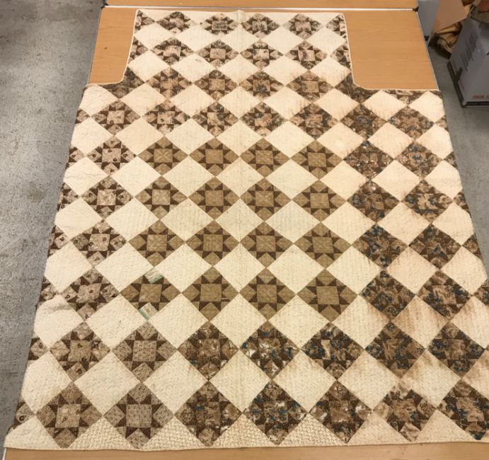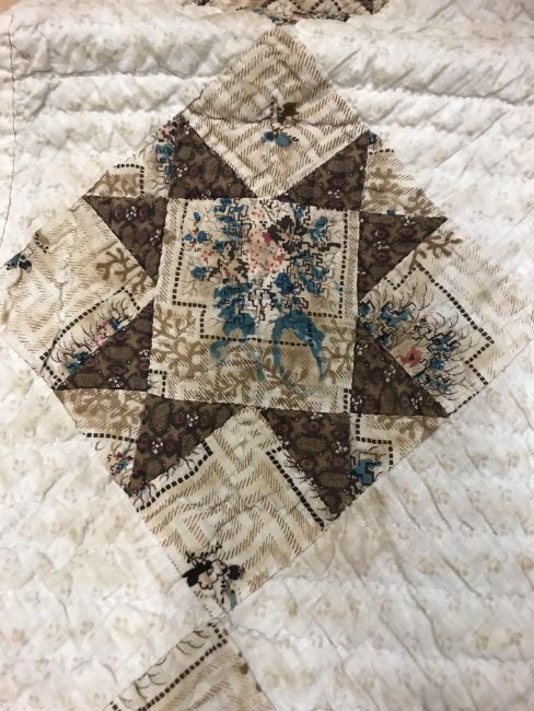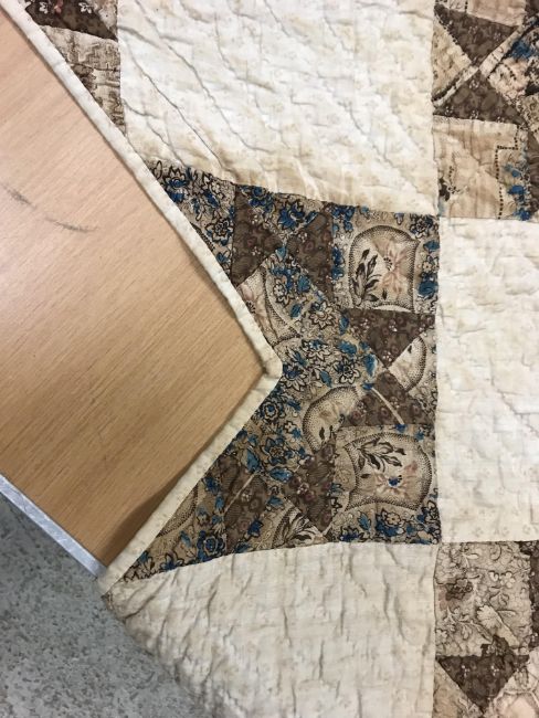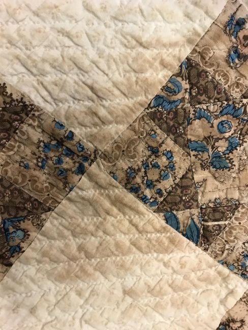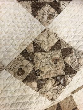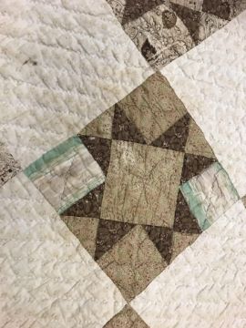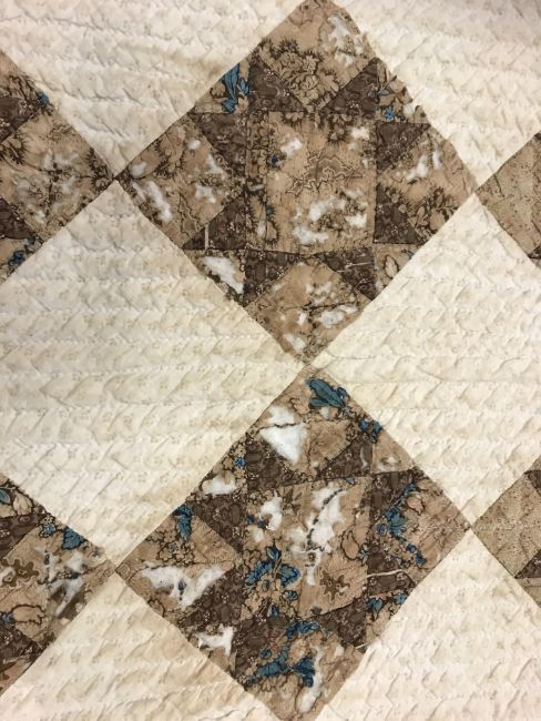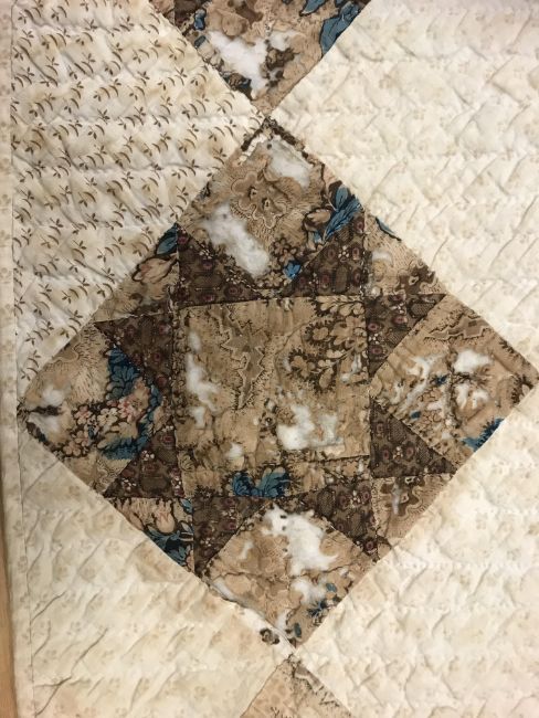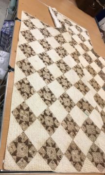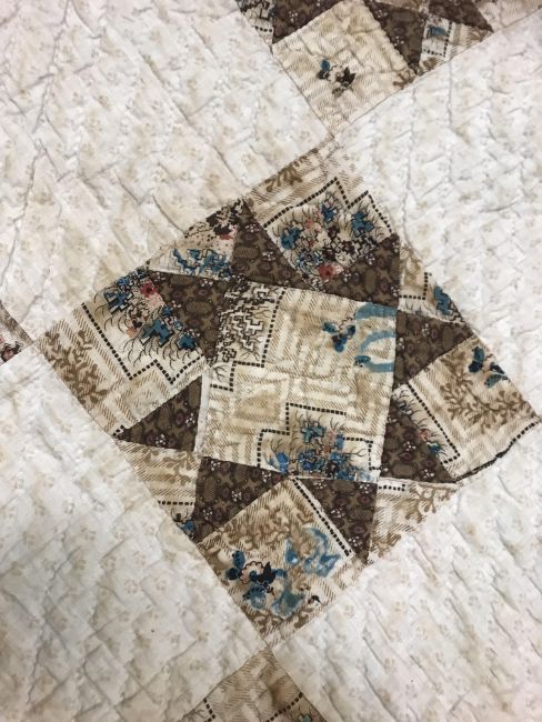 A 19th Century saw, tooth, star pattern patchwork quilt (possible for a four poster bed) in cream and brown, 242 cm at widest point x 241 at longest point