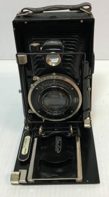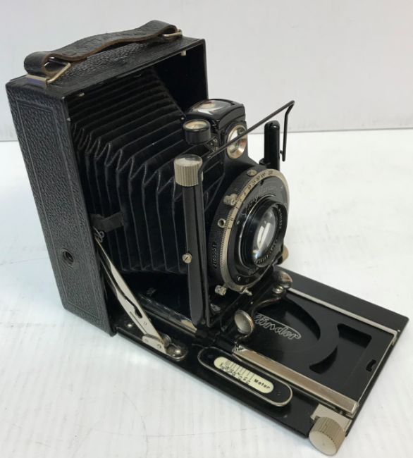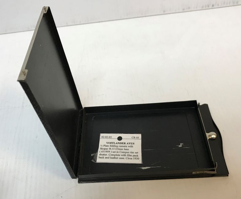 A Voigtländer Photoporst Nüremberg "Avus" quarter plate bellows camera (No.A556482) with Skopar 1:4.5 - F=13.5cm lens and Compur rim set shutter, complete with film pack and leathe case, circa 1930