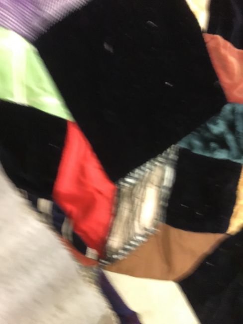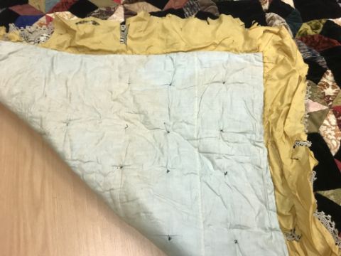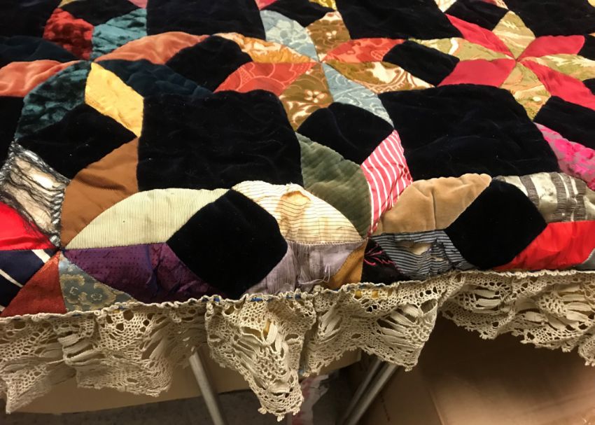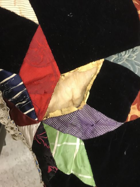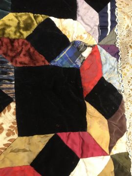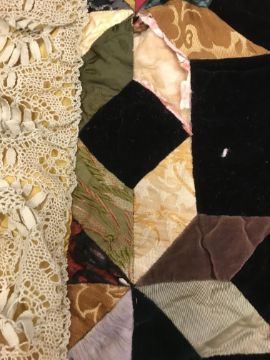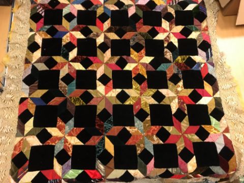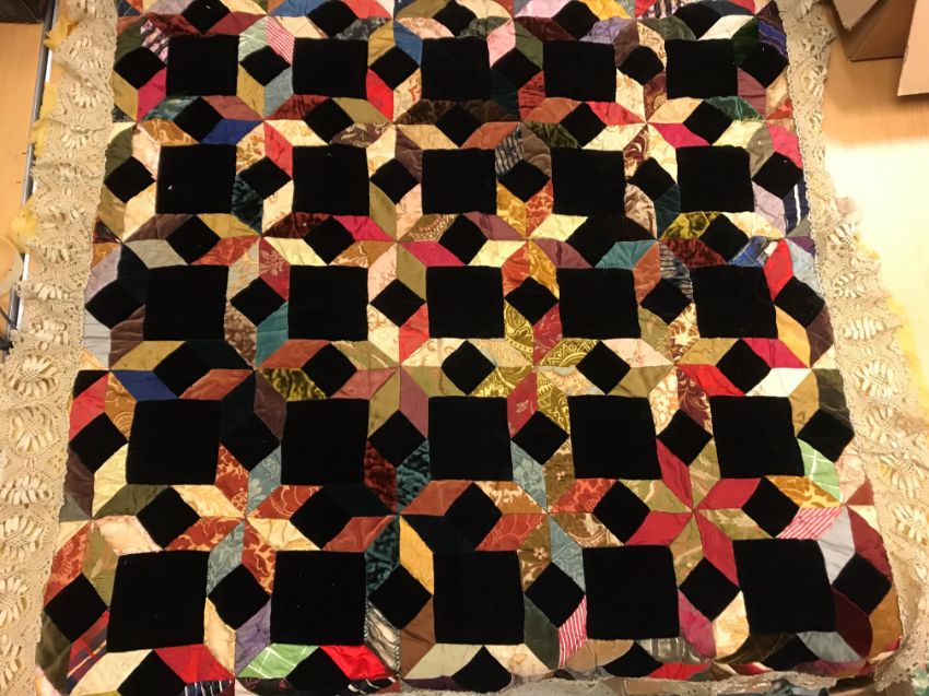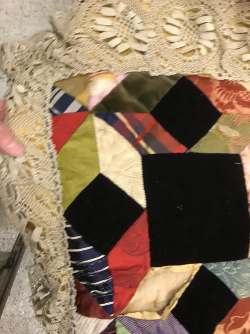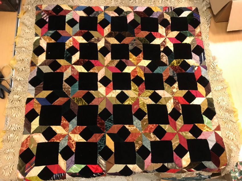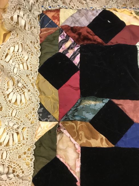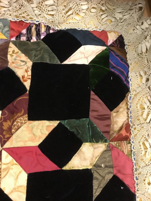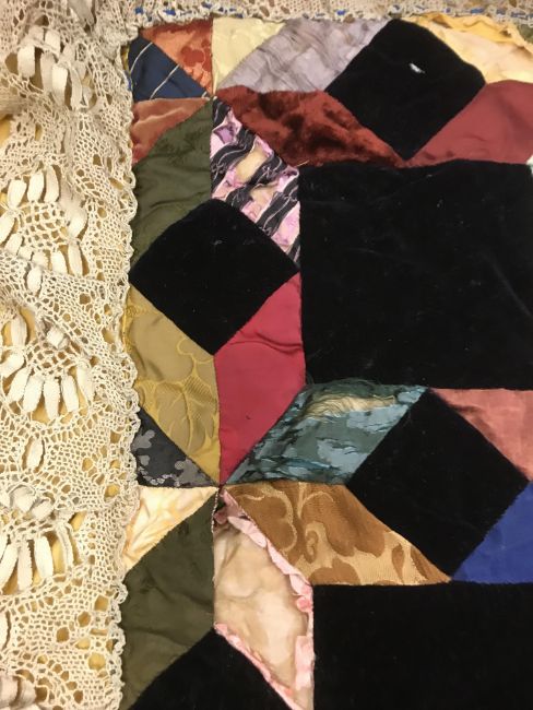 A Victorian patchwork table cover in velvet and upholstery fabrics with lace trim, approx 135 cm x 135 cm including lace work