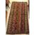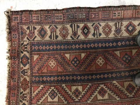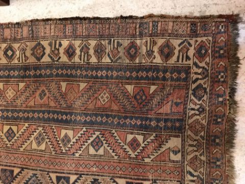 A vintage Caucasian carpet, the central panel set with striped design in blue, red and brown, within a stepped blue, red and brown flower head set border, approx 252 cm x 135 cm