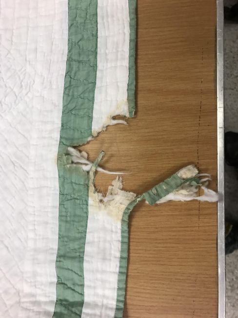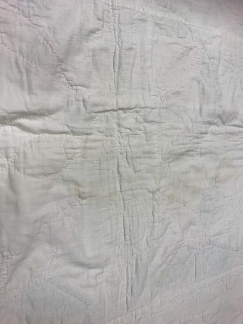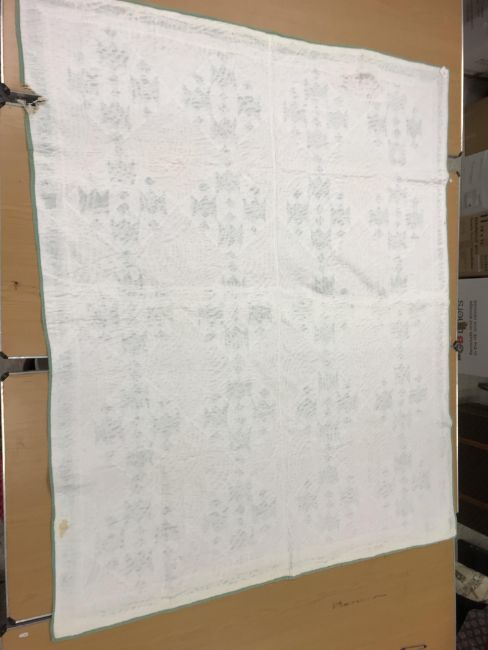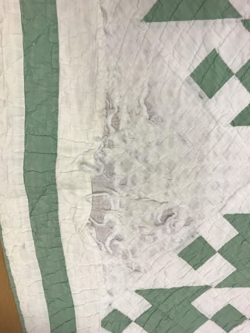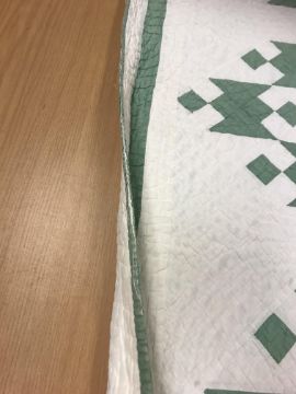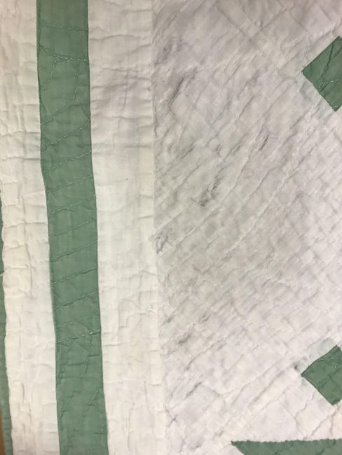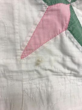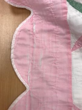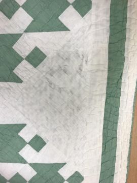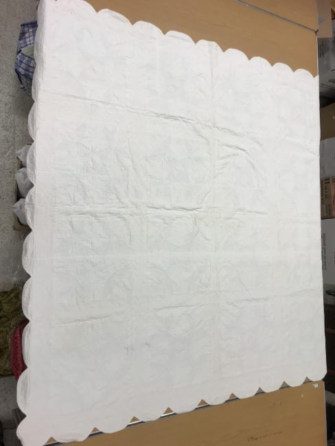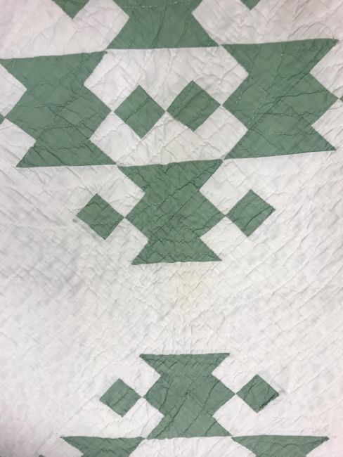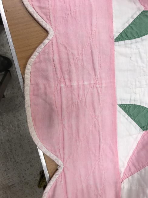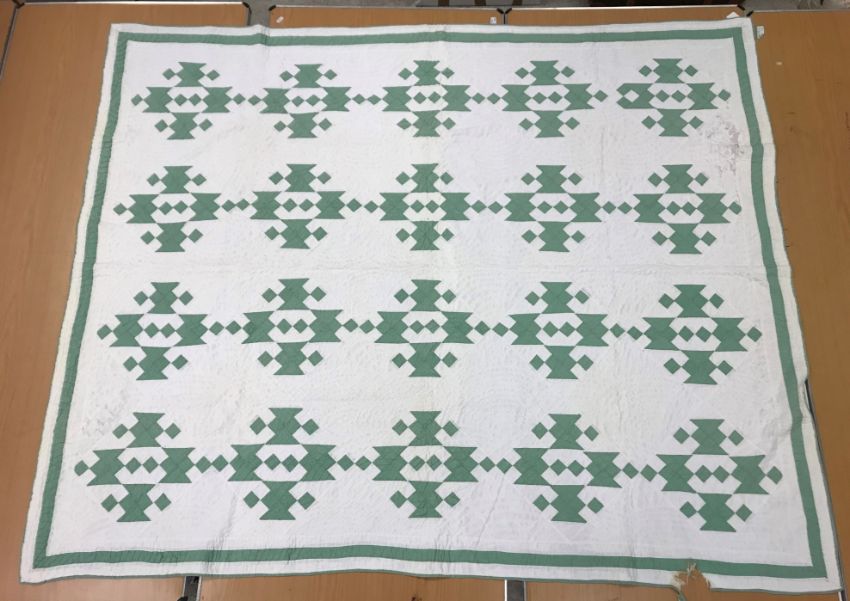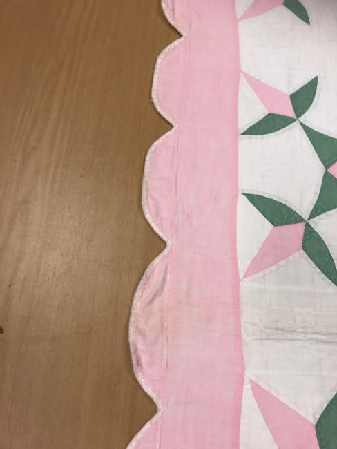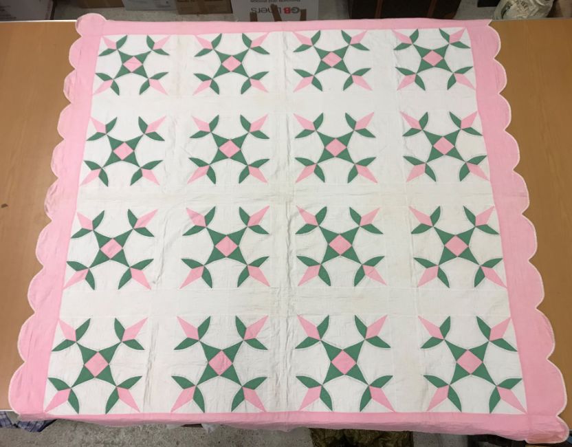 A 20th Century turkey tracks quilt in pink, white and green, with scalloped edge, 200 cm x 206 cm, together with a further 20th Century green and white quilt, 170 cm x 204 cm