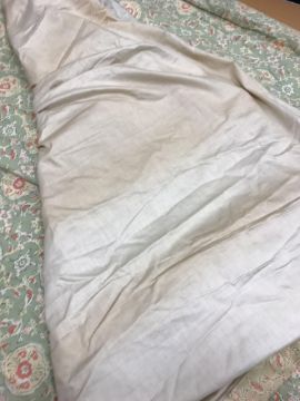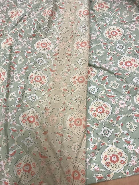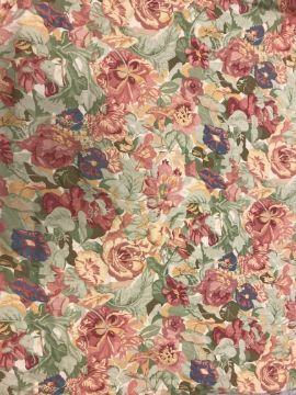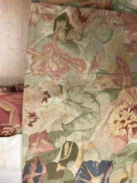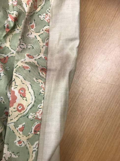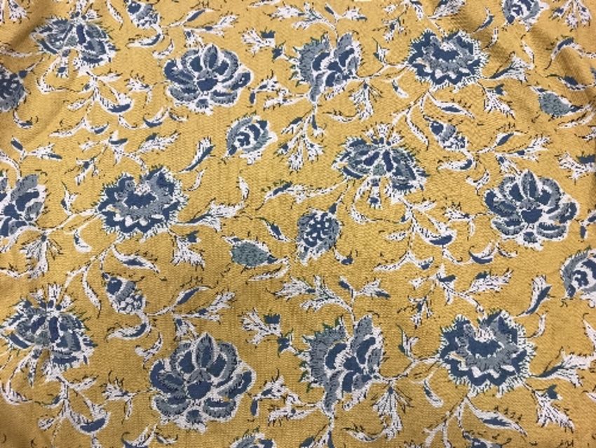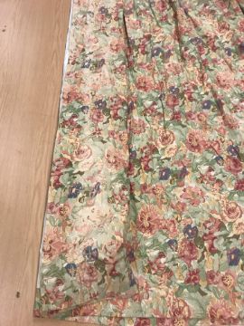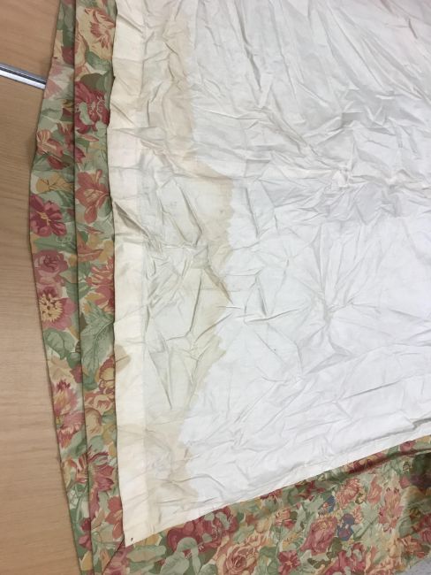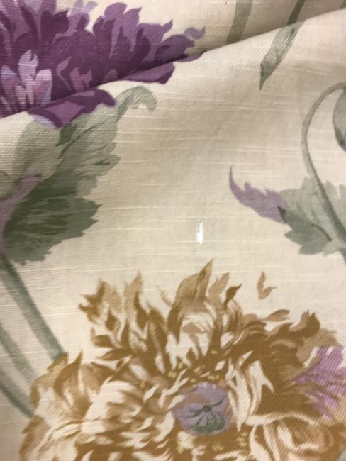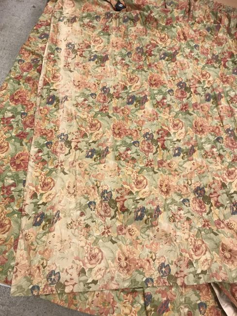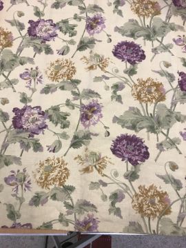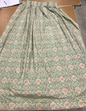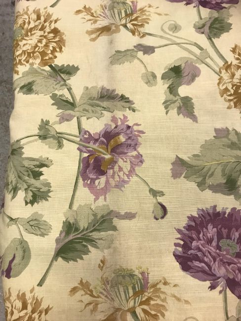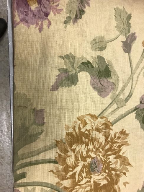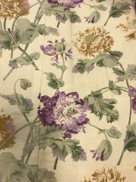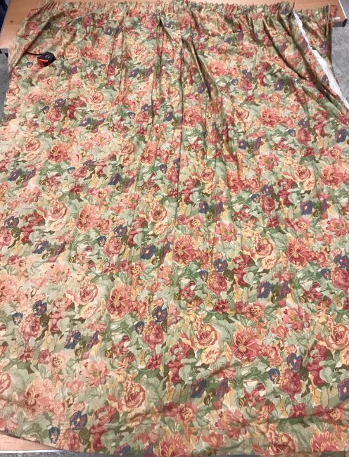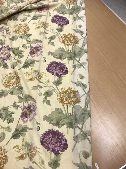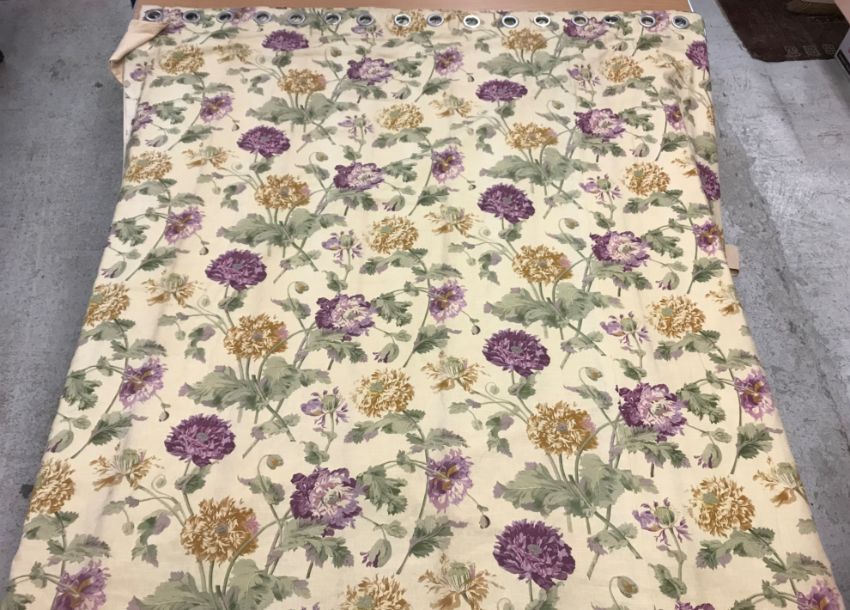 A single cotton twill mustard and blue foliate decorated interlined curtain with fixed triple pencil pleat headings, approx 230 cm drop x 305 cm wide at bottom and 165 cm wide at top, together with a pair of cotton Arthur Sanderson foliate decorated green and pink lined curtains with fixed triple pencil pleat with button heading, approx 207 cm drop x 109 cm wide at bottom and 84 cm wide at top, two pairs of Honister Lakelade Collection by Beaumont & Fletcher for Osborne & Little cotton lined curtains with taped pencil pleat headings, one approx 210 cm drop x 250 cm wide at bottom, the other 214 cm drop x 191 cm wide at bottom and a pair of cotton Laura Ashley floral decorated purple and cream curtains with yellow gingham linings and fixed eyelet headings, approx 200 cm drop x 200 cm wide at bottom and 200 cm wide at top CONDITION REPORTS Single mustard and blue curtain - Good - slight sun fading to one edgeArthur Sanderson curtains - Fair - one badly sun faded edge and liningsHonister Lakelade Collection curtains - Fair - significant sun fading, some staining to linings, etcLaura Ashley curtains - Poor - sun faded, some staining and some rips around fixed eyeletsAll have general wear and tear conducive with age and use. See images for examples and more detail.