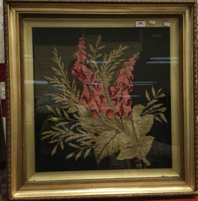 A tapestry picture depicting Foxgloves on a black and green ground, framed and glazed, approx 57 cm x 53 cm