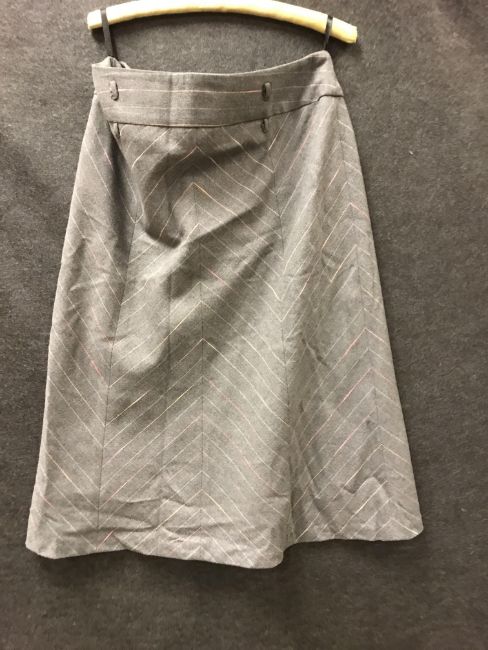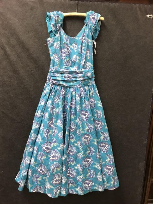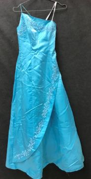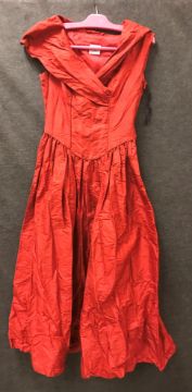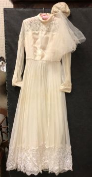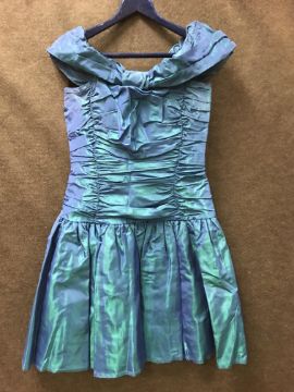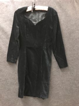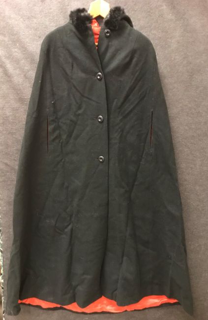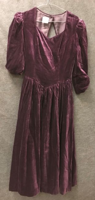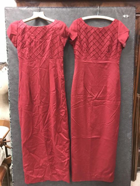 A collection of ladies clothing to include a Laura Ashley sleeveless dress in floral turquoise material, size 10, a black wool hooded cape with scarlet lining, a Laura Ashley purple velvet evening dress with sweetheart neckline and revealed back, size 10, an 1880 Club green paisley waistcoat, a Next black velvet cocktail dress, size 10, a Laura Ashley blue and green shot silk cocktail dress with gathered bodice, size 12, two red full length short sleeved dresses with pin tucked trellis design to bodice, a red Laura Ashley silk dress with cross over neckline, size 10, a Sticky Fingers green striped wool skirt and a Morgan & Co. turquoise sleeveless and strapless evening dress with beaded decoration, a wool college scarf, together with a cream wedding dress with sheer sleeves and lace yoke and border with associated cap and veil