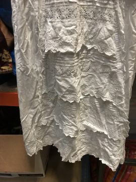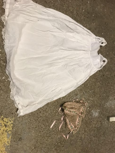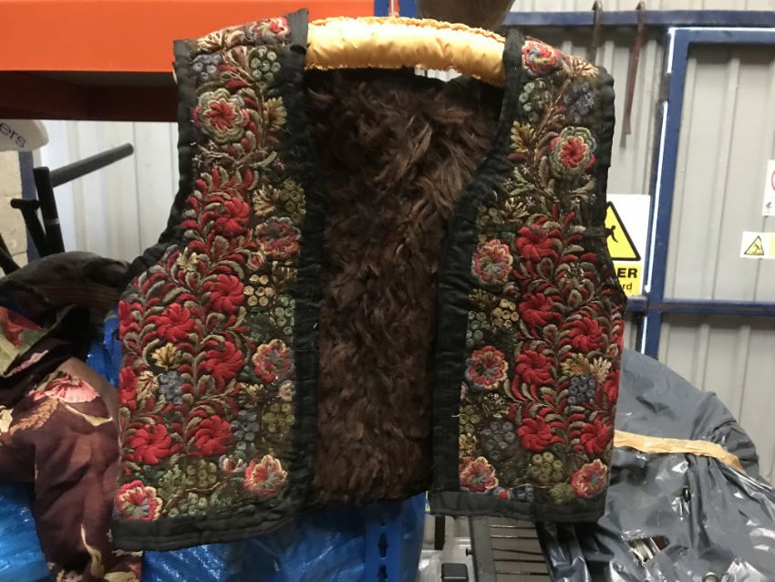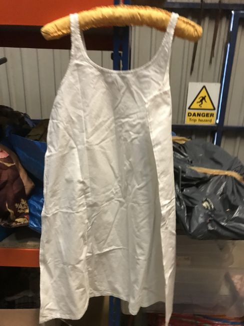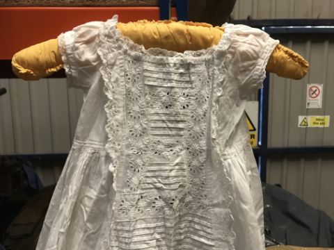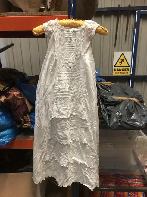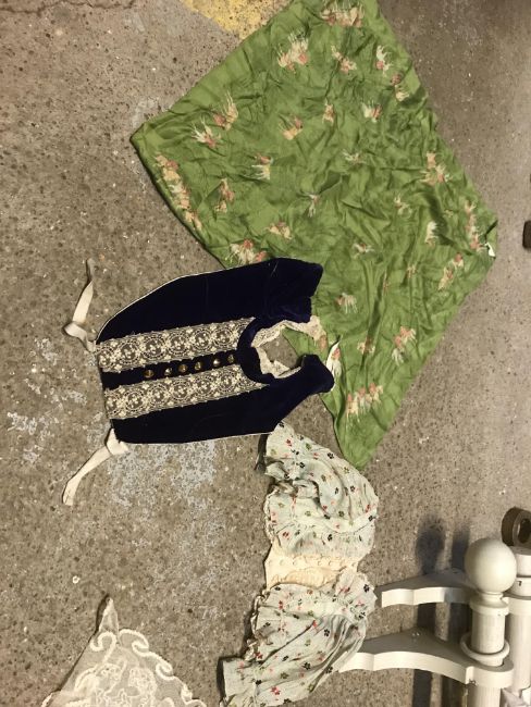 A box of assorted Victorian and later mainly children's clothing to include a Victorian silk two piece outfit, linen undergarment, padded bed jacket, etc