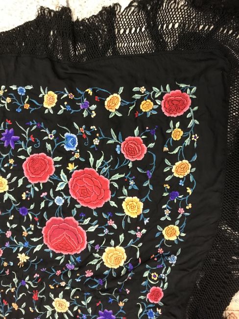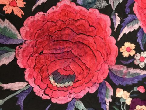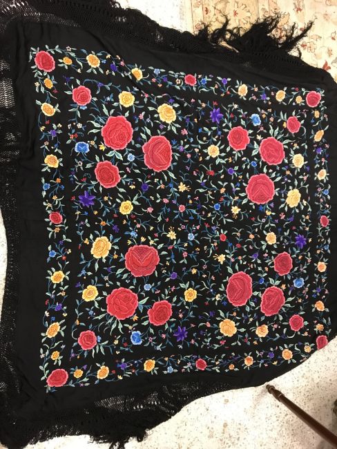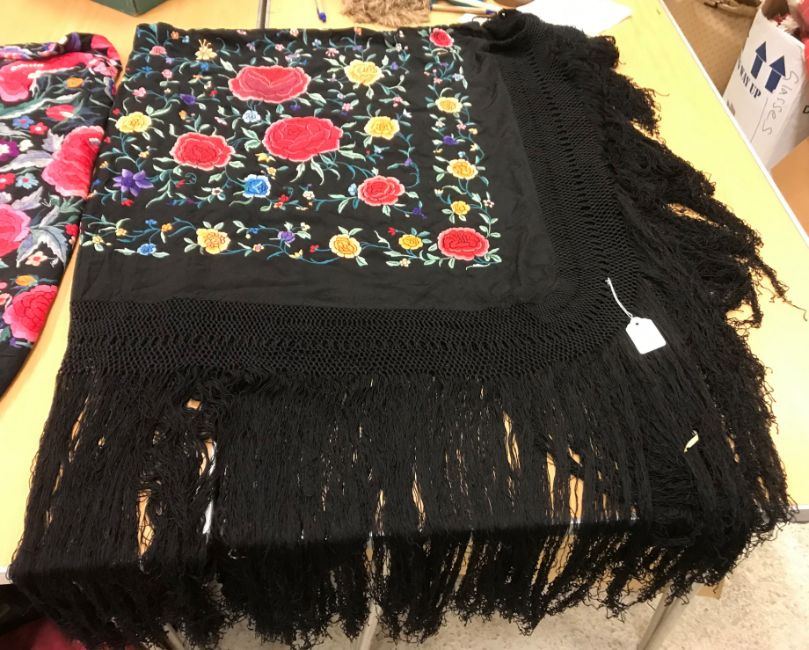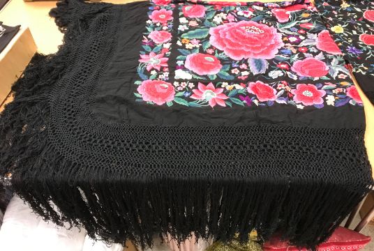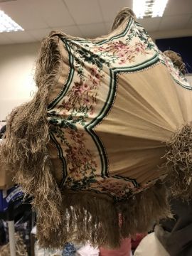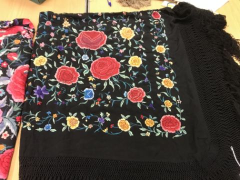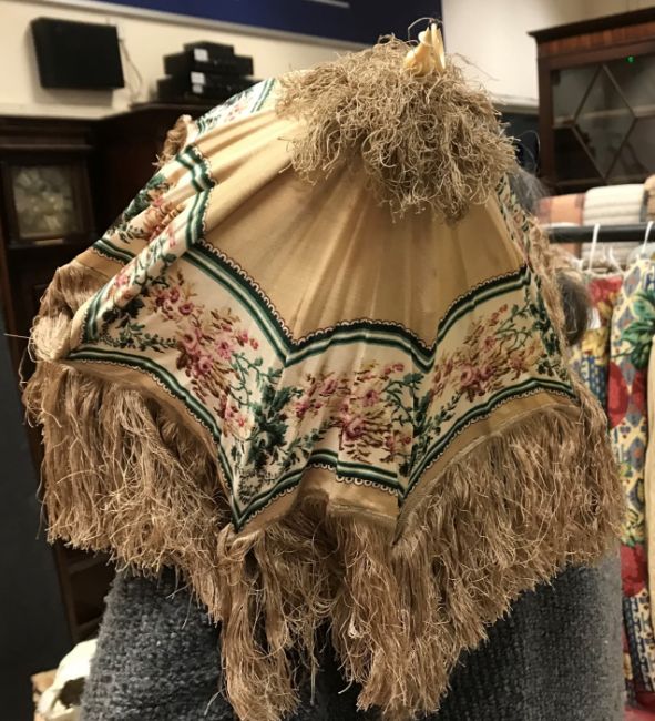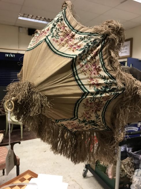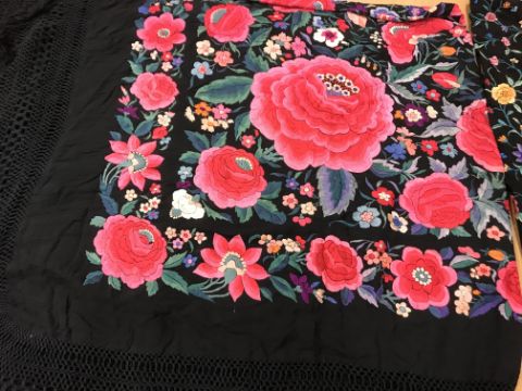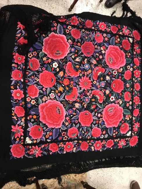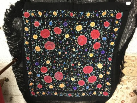 Two early 20th Century piano shawls with embroidered floral decoration, together with a 19th Century ivory handled parasol, the plated ferrule inscribed "Sangsters" CONDITION REPORTS One piano shawl is approx. 124 cm x 124 cm excluding fringing. The second is 163 cm x 154 cm excluding tassels/trim. Condition on both shawls - both have general wear and tear conducive with age and use to include some pulls to the embroidery.Parasol - silk underneath is currently rip free, however the parasol appears fragile and has not been put up fully. Otherwise general wear and tear conducive with age and use. The handle has some small losses, otherwise general wear and tear conducive with age and use - see images for more details