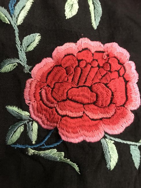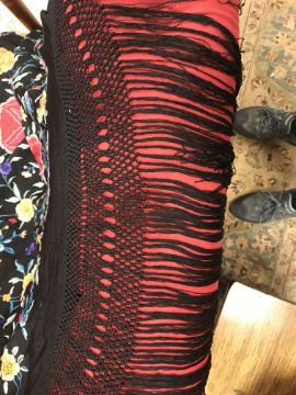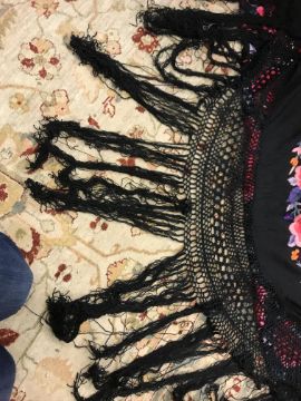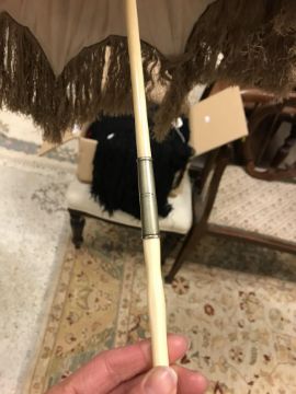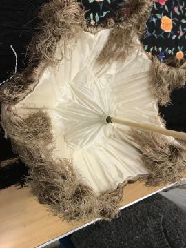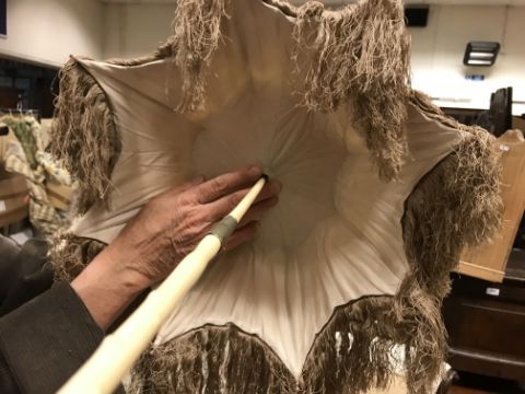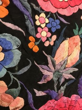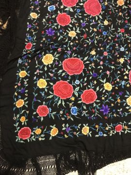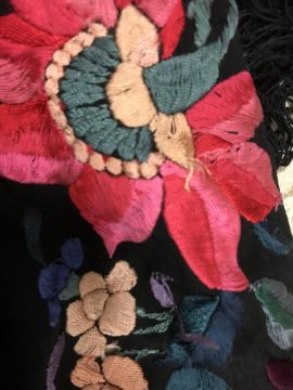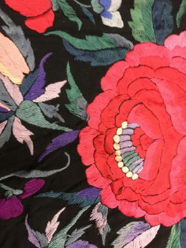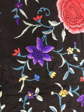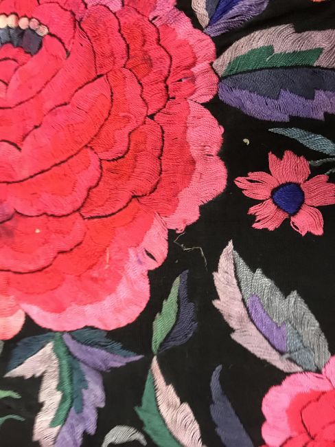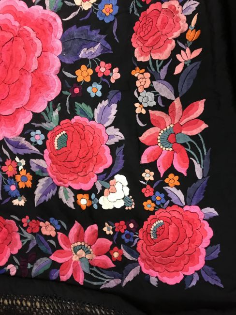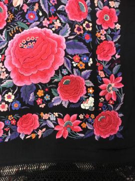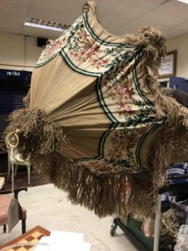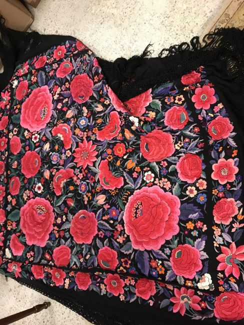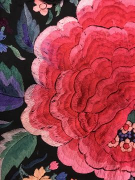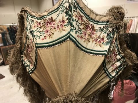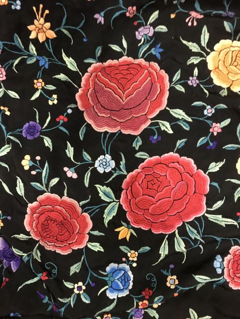 Two early 20th Century piano shawls with embroidered floral decoration, together with a 19th Century ivory handled parasol, the plated ferrule inscribed "Sangsters" CONDITION REPORTS One piano shawl is approx. 124 cm x 124 cm excluding fringing. The second is 163 cm x 154 cm excluding tassels/trim. Condition on both shawls - both have general wear and tear conducive with age and use to include some pulls to the embroidery.Parasol - silk underneath is currently rip free, however the parasol appears fragile and has not been put up fully. Otherwise general wear and tear conducive with age and use. The handle has some small losses, otherwise general wear and tear conducive with age and use - see images for more details