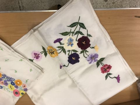 A box of assorted table linens to include place mats, tray cloths, etc and various crochet / lace doilies, together with a box of linens for embroidery including two cpmpleted tea cloths, a number part completed, some transfer printed, some blank and assorted embroidery threads