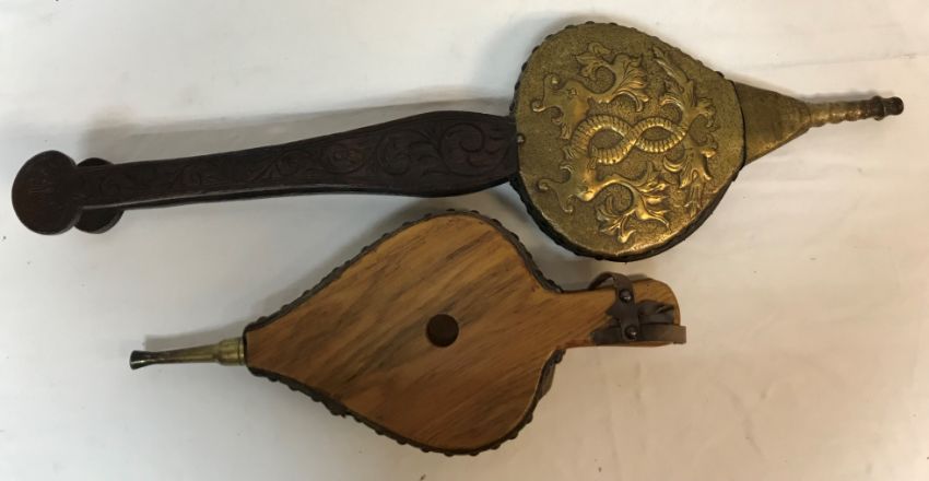 A pair of carved oak bellows with embossed sylised dolphin decoration, 77 cm long, together with a pair of 20th Century oak bellows with studded decoration and brass nozzle, 46 cm long overall
