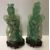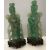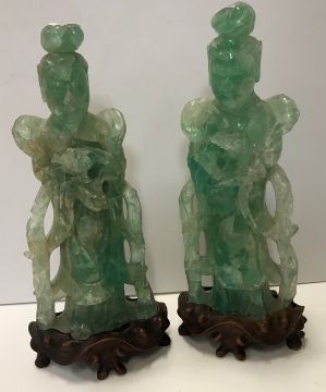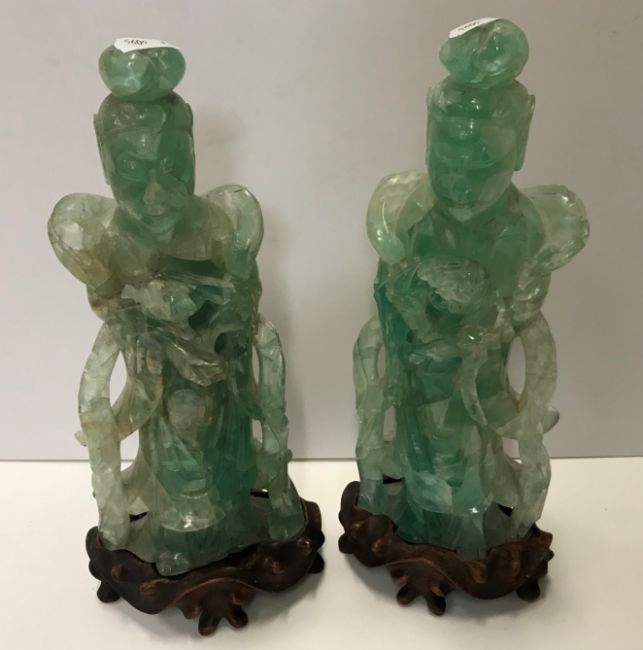 A pair of Chinese green quartz figures of Guanyin with flower, 26.6 cm high, on associated carved wooden bases, 30 cm high overall