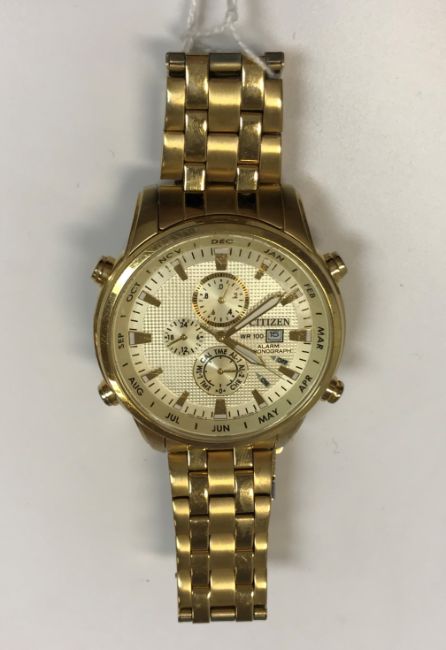 A Citizen gold plated cased alarm chronograph gent's wristwatch with multiple dials and date aperture