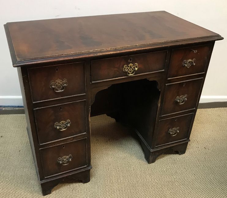 A figured mahogany kneehole desk in the George III taste, the top cross banded and with moulded edge over a central drawer and kneehole flanked by two banks of three drawers with brass swan neck raised on bracket feet 91 cm wide x 50.5 cm deep x 74.5 cm high