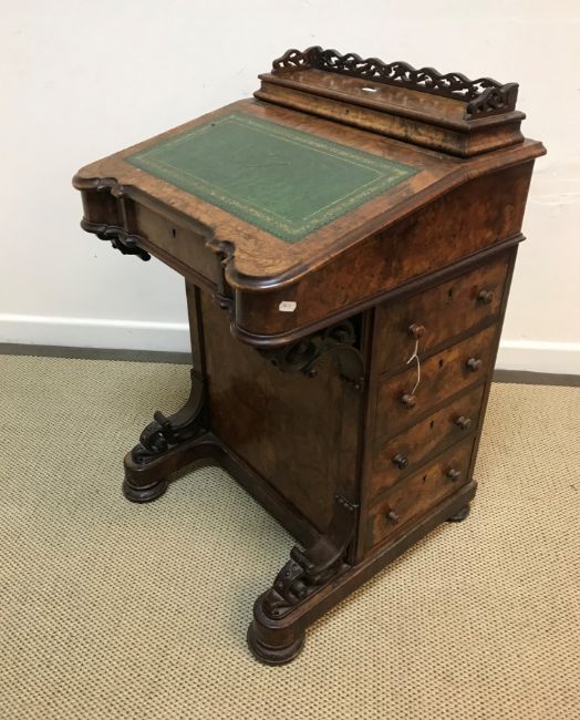 A Victorian burr walnut davenport desk, the top with three quarter galleried stationery compartment over a sloping writing surface enclosing a basic fitted interior over four side drawers opposite four dummy drawers raised on squat cup feet 54 cm wide x 54 cm deep x 87 cm high