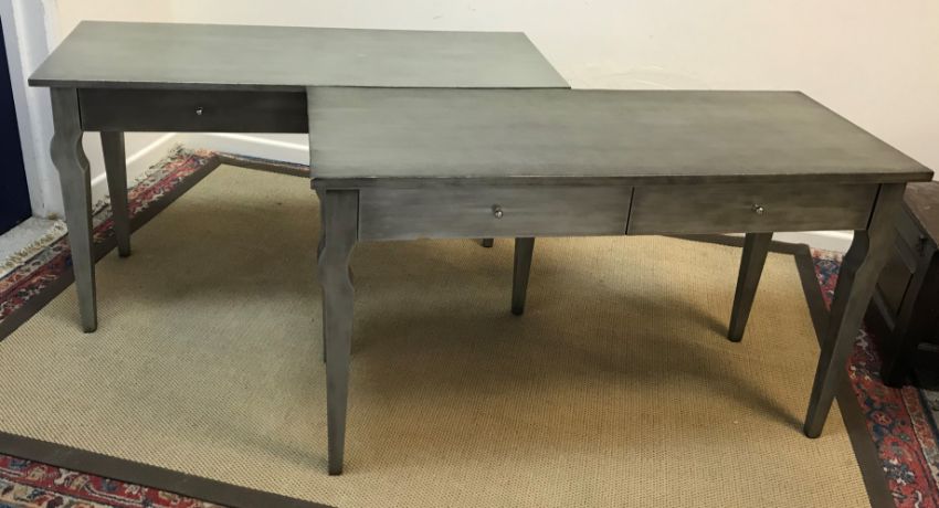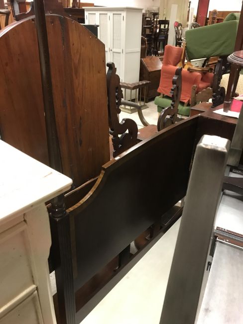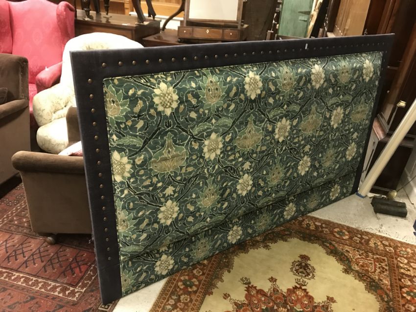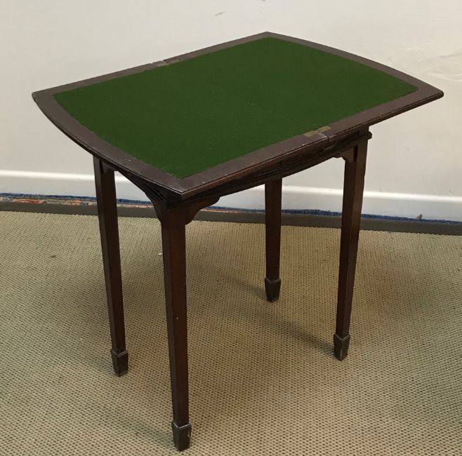 A pair of modern silver painted two drawer side tables on square tapered legs 130 cm wide x 53 cm deep x 75.5 cm high, two modern mahogany pedestal occasional tables 60 cm diameter x 60 cm high and a modern bow fronted mahogany foldover card table with two drawers on square tapered legs to spade feet 55 cm wide x 74.5 cm high, together with a wooden headboard and an upholstered headboard