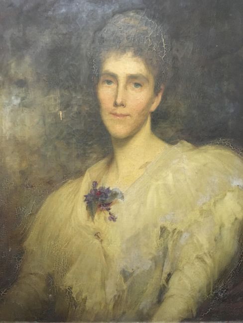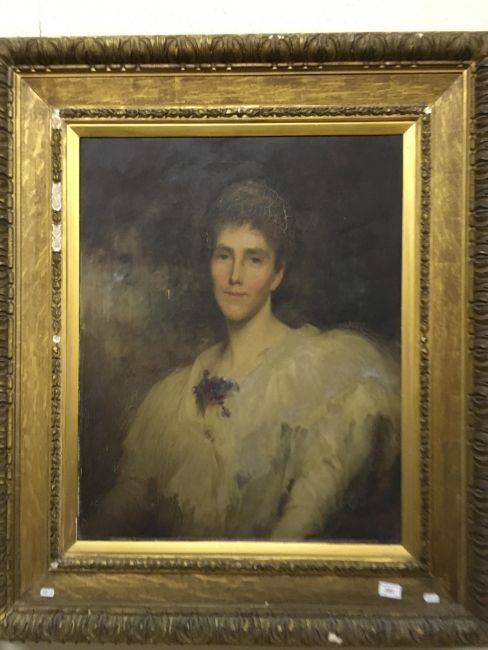 SHIRLEY CHARLES LLEWELLEN SLOCOMBE (Fl. 1887-1904) “Violet, Viscountess Melville", study of lady in white dress with floral bouquet at her breast, a portrait study, head and shoulders, oil on canvas, signed and dated 1897, 76 cm x 61 cm